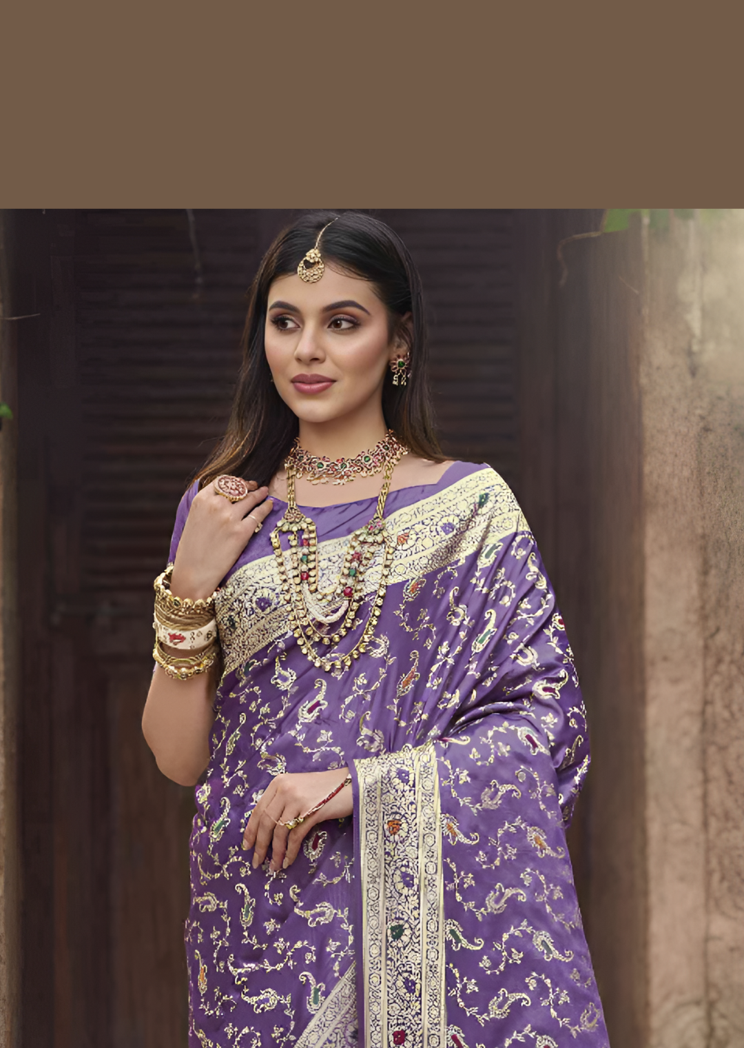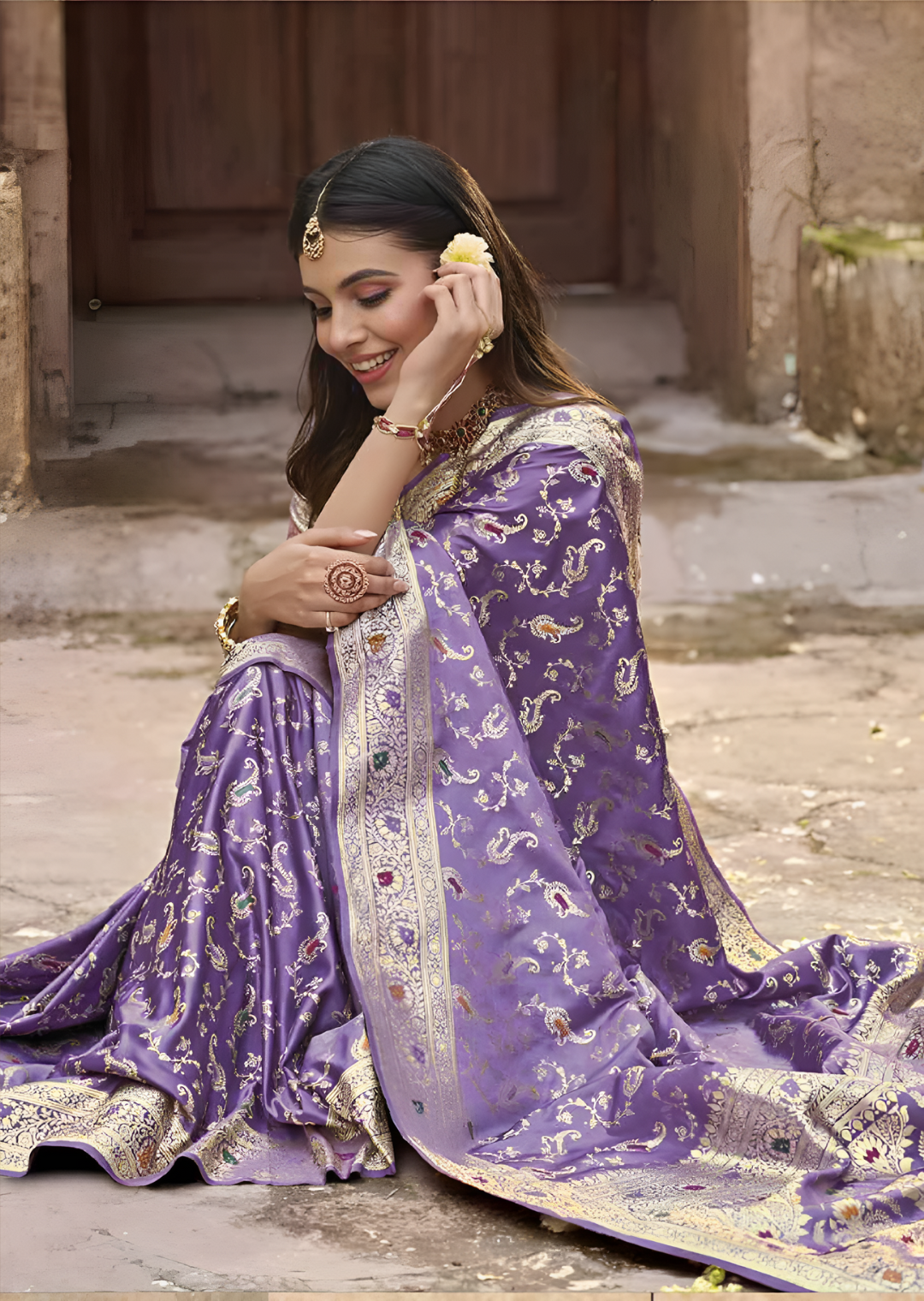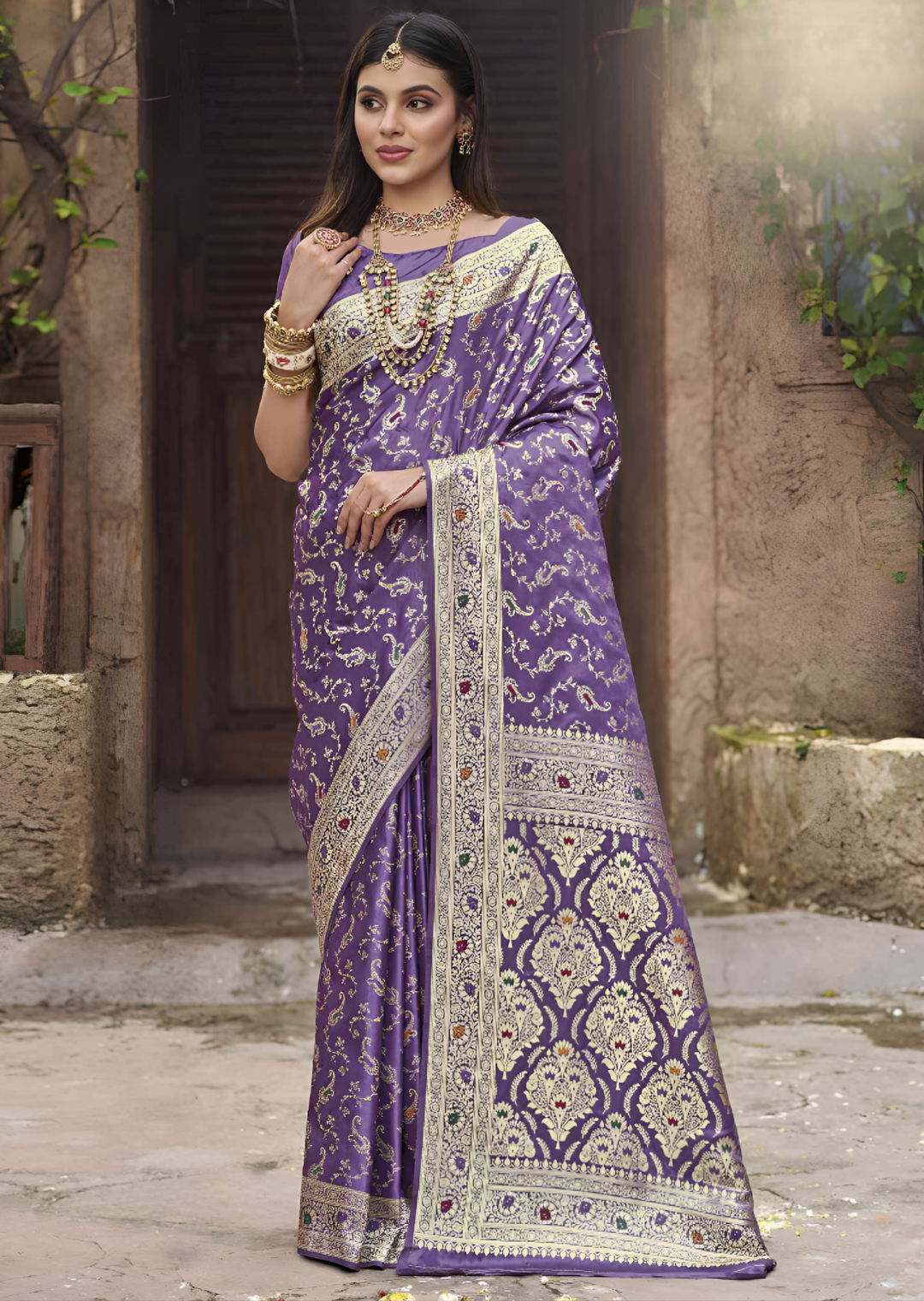 Hues of Purple Colour on this timeless Silk Banarasi weave make for the perfect festive outfit. Highlighting culture and ethnic authenticity, this soft, lustrous, and luxurious classic is a must-have for your traditional wardrobes. It features intricate floral and paisley motifs with Meena work that are woven into the fabric, making the saree a true work of art. The saree has a luxurious feel to it, with its soft and silky texture, and is sure to make a statement at any formal or traditional event. Style this saree with a personal touch or go the classic way, you are bound to look graceful! Note: Color may slightly be different from the actual item due to photographic lighting sources or the monitor’s settings. The blouse shown is for modelling purposes only.